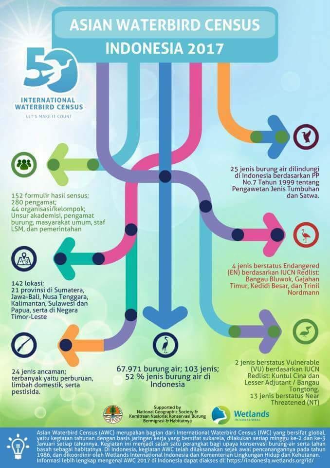 … dengan dukungan dari para kontributor data dan informasi dari seluruh Indonesia, kegiatan citizen science Asian Waterbird Census 2017 mendapatkan hasil yang lebih meningkat dibandingkan dengan tahun 2016.