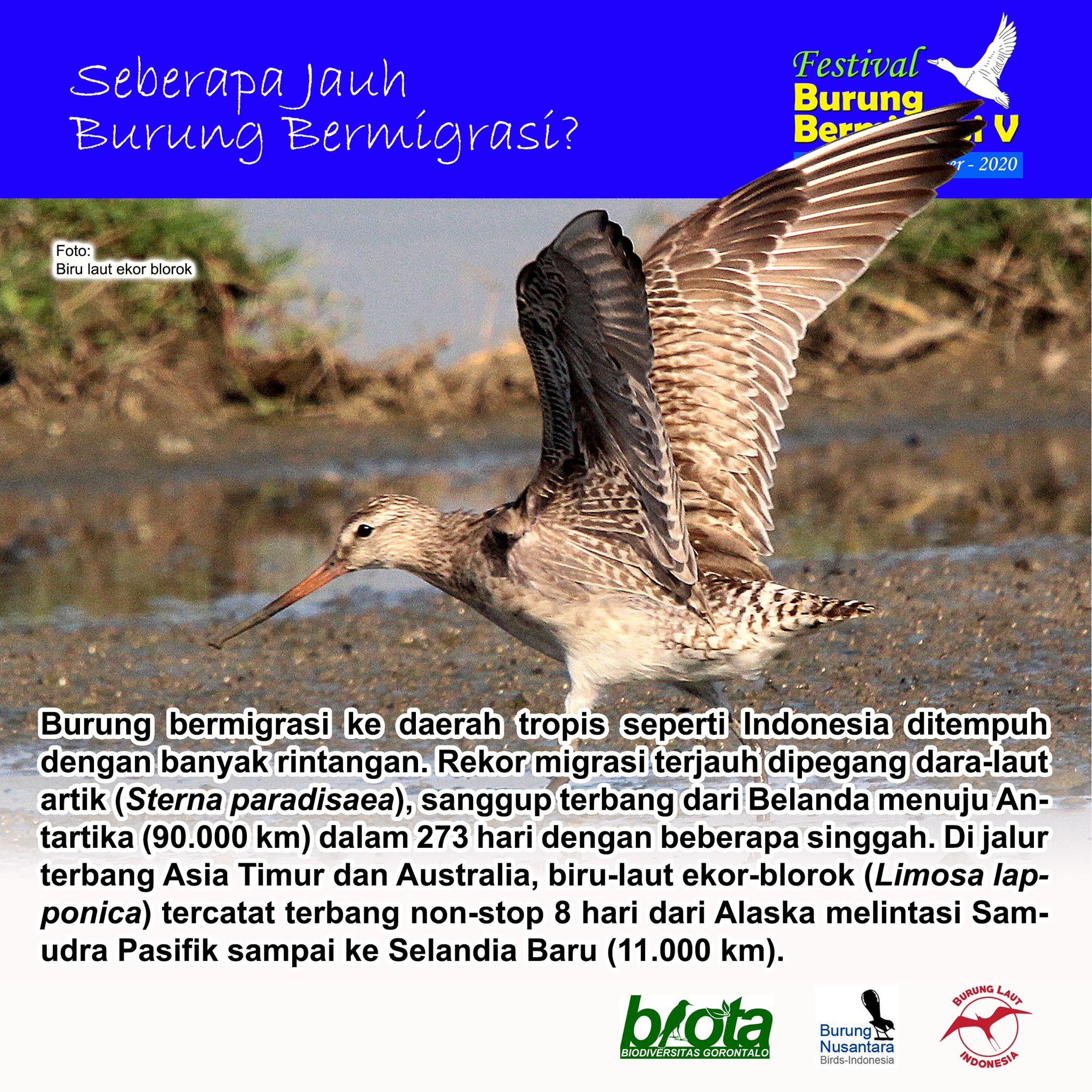 Untuk jalur terbang Asia Timur dan Australia, termasuk Indonesia, jenis biru-laut ekor-blorok (Limosa lapponica) pernah tercatat mampu terbang non-stop selama delapan hari dari Alaska, langsung melintasi pusat Samudra Pasifik sampai ke Selandia Baru, sekitar 11 ribu kilometer. Dibantu oleh angin kencang, burung ini melaju dengan rata-rata 56 kilometer per jam.